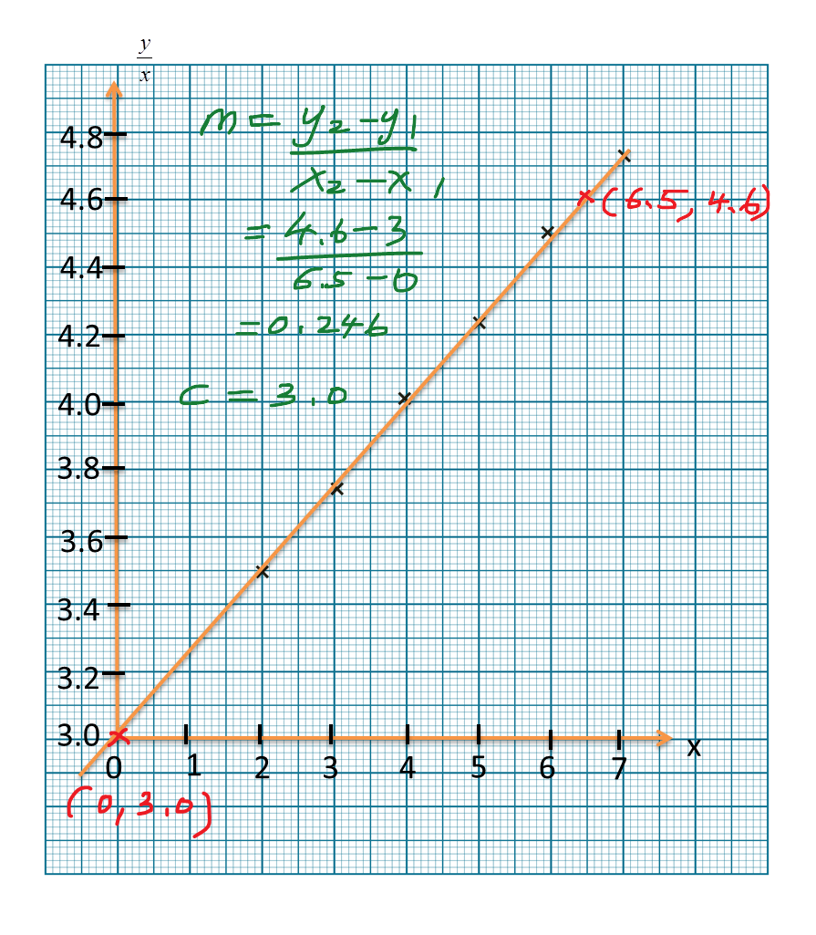 Cari kecerunan garis lurus penyuaian terbaik, m, dan pintasan-Y daripada graf.