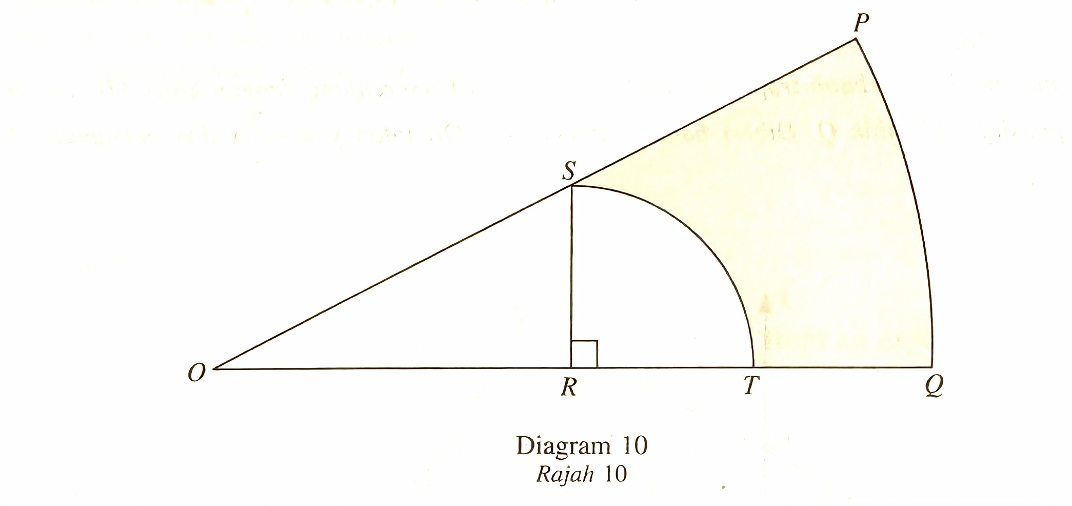Dalam Rajah 10, POQ ialah sektor sebuah bulatan berpusat O dan berjejari 26 cm. SRT ialah suku sebuah bulatan berpusat R dan berjejari 5 cm.