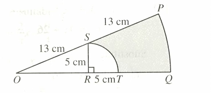 $$ \begin{aligned} &\text { Luas kawasan berwarna }\\ &\begin{aligned} = & \text { Luas sektor } P O Q-\text { Luas sukuan } S R T \\ & – \text { Luas } \triangle S O R \\ = & \frac{1}{2}\left(26^2\right)(0.39)-\frac{1}{4} \times \pi\left(5^2\right)-\frac{1}{2}(12)(5) \\ = & 82.18 \mathrm{~cm}^2 \end{aligned} \end{aligned} $$